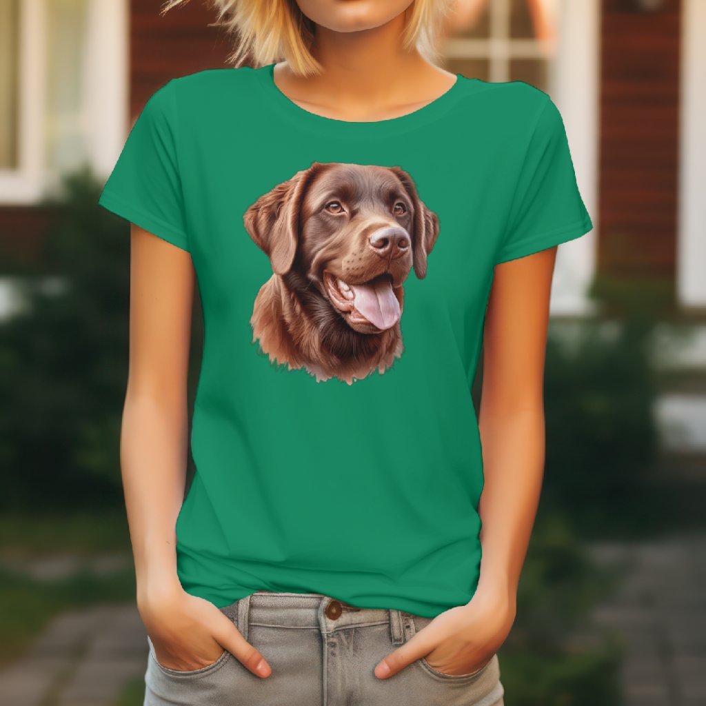 Dominantou trička je vysoce detailní a realistický portrét hlavy Chesapeake Bay retrívra. Motiv precizně zachycuje jeho inteligentní a laskavý výraz, včetně typicky zvlněné srsti a teplých hnědých očí. Umělecké stínování v čokoládových tónech dodává grafice hloubku, díky čemuž tento originální motiv psa na barevném podkladu (např. limetkové jako na obrázku) doslova ožívá a působí velmi moderně.