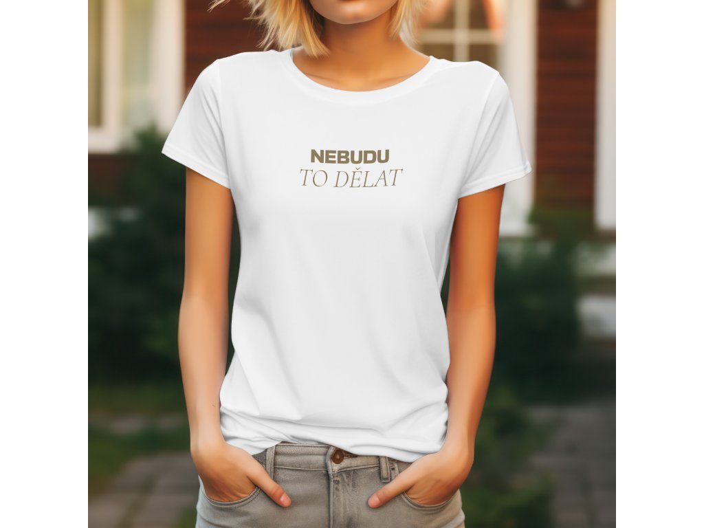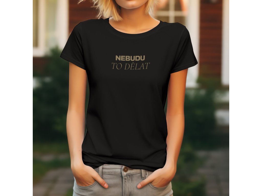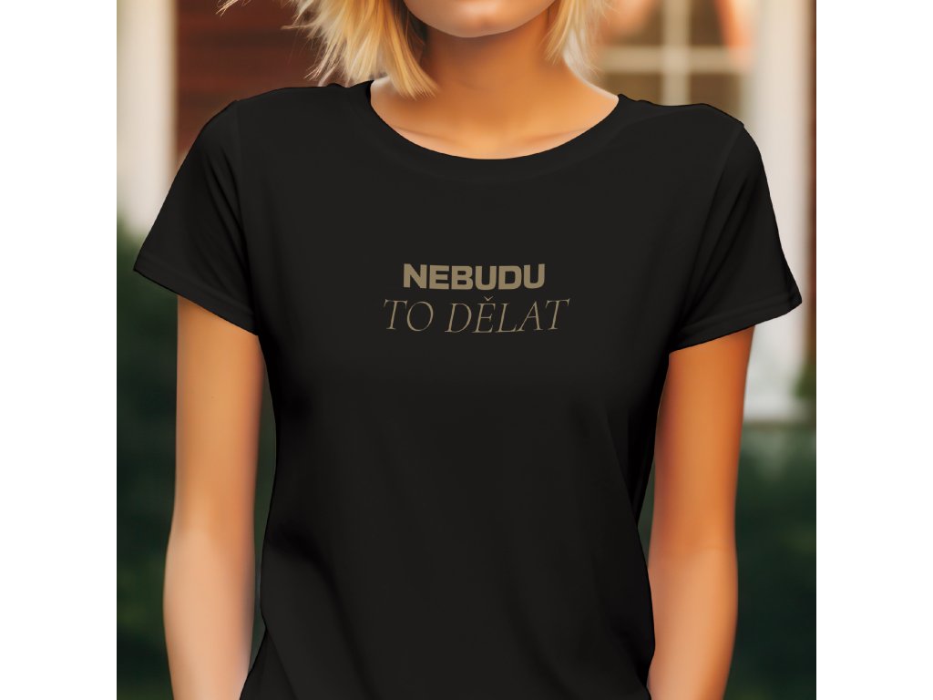Nápis je proveden v elegantní, lehce retro zlaté barvě, která kontrastuje s barvou trička. Zlatá barva dodává prohlášení na vážnosti, ačkoli je jeho obsah ryze humorný a odlehčený. Horní slovo NEBUDU je psáno tučným písmem, zatímco TO DĚLAT je v jemnějším fontu, což vizuálně zdůrazňuje hlavní pointu.