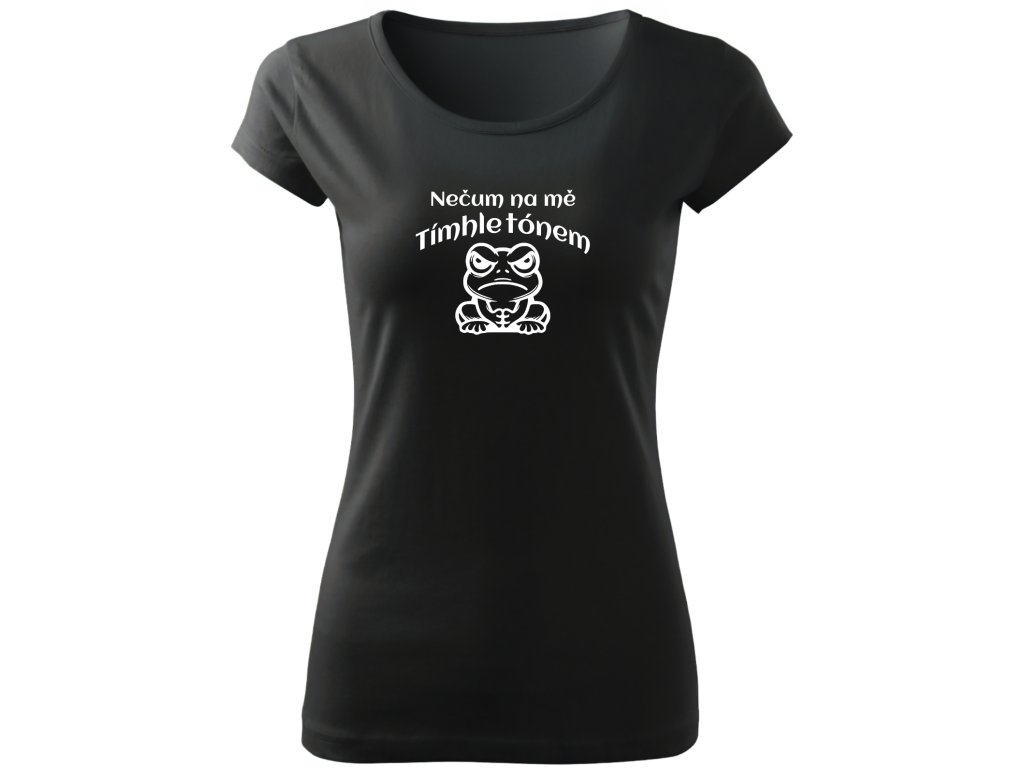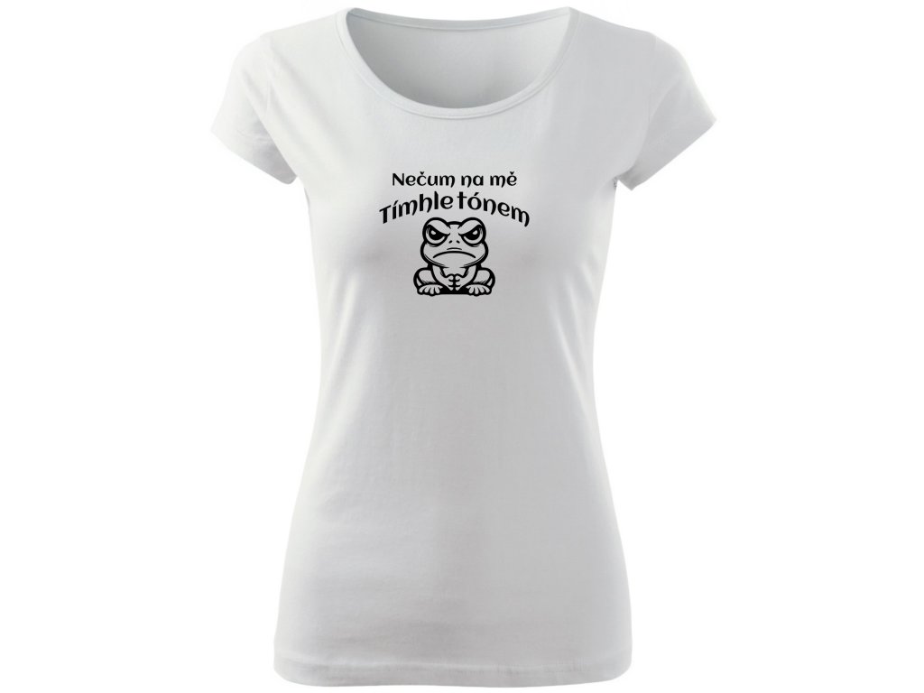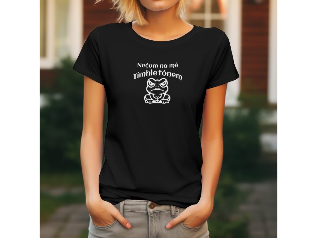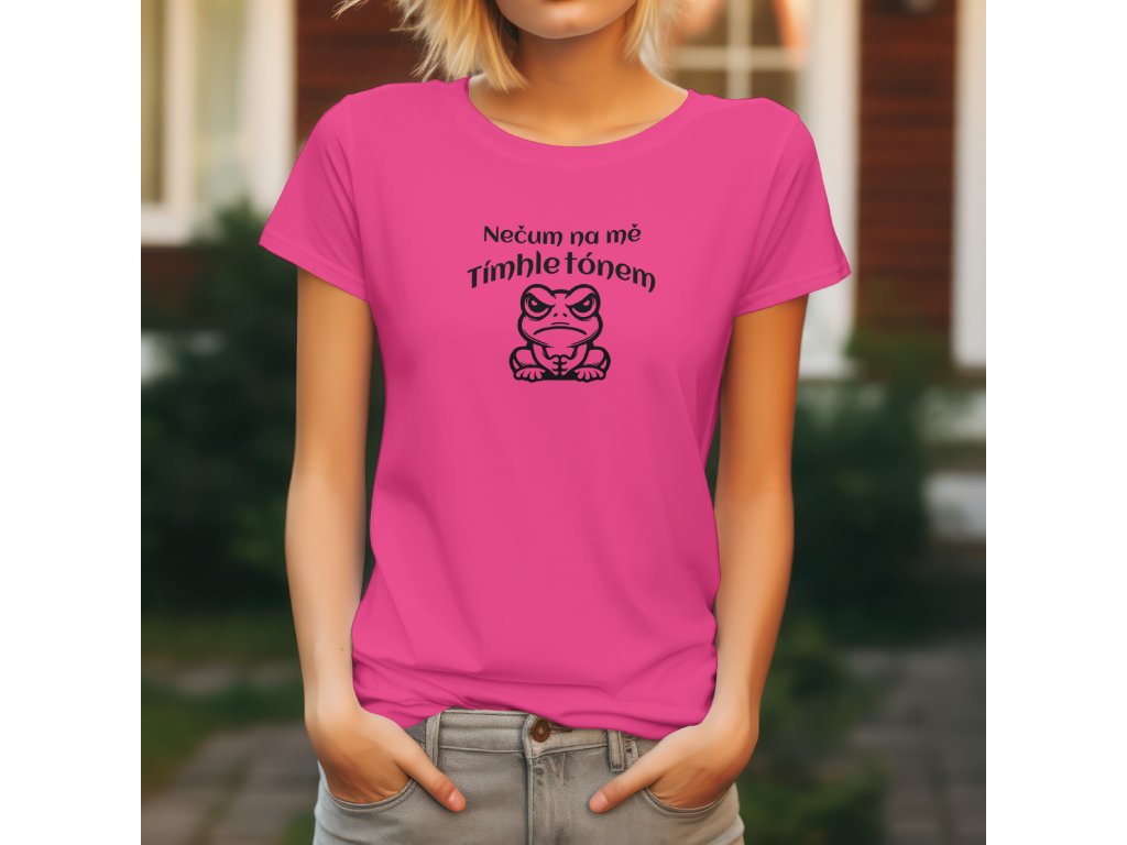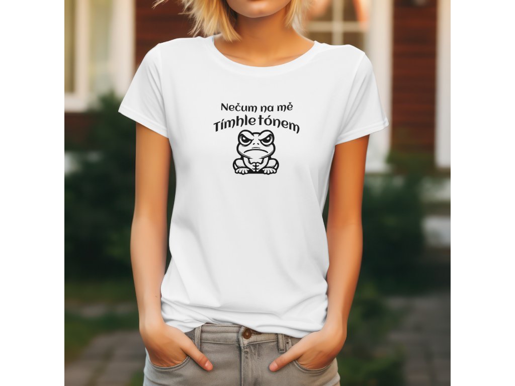 Text: Hláška "Nečum na mě Tímhle tónem" je psána tučným, snadno čitelným fontem. Vizuálně připomíná mluvenou hrozbu a je psána s velkým T, což posiluje komický efekt.