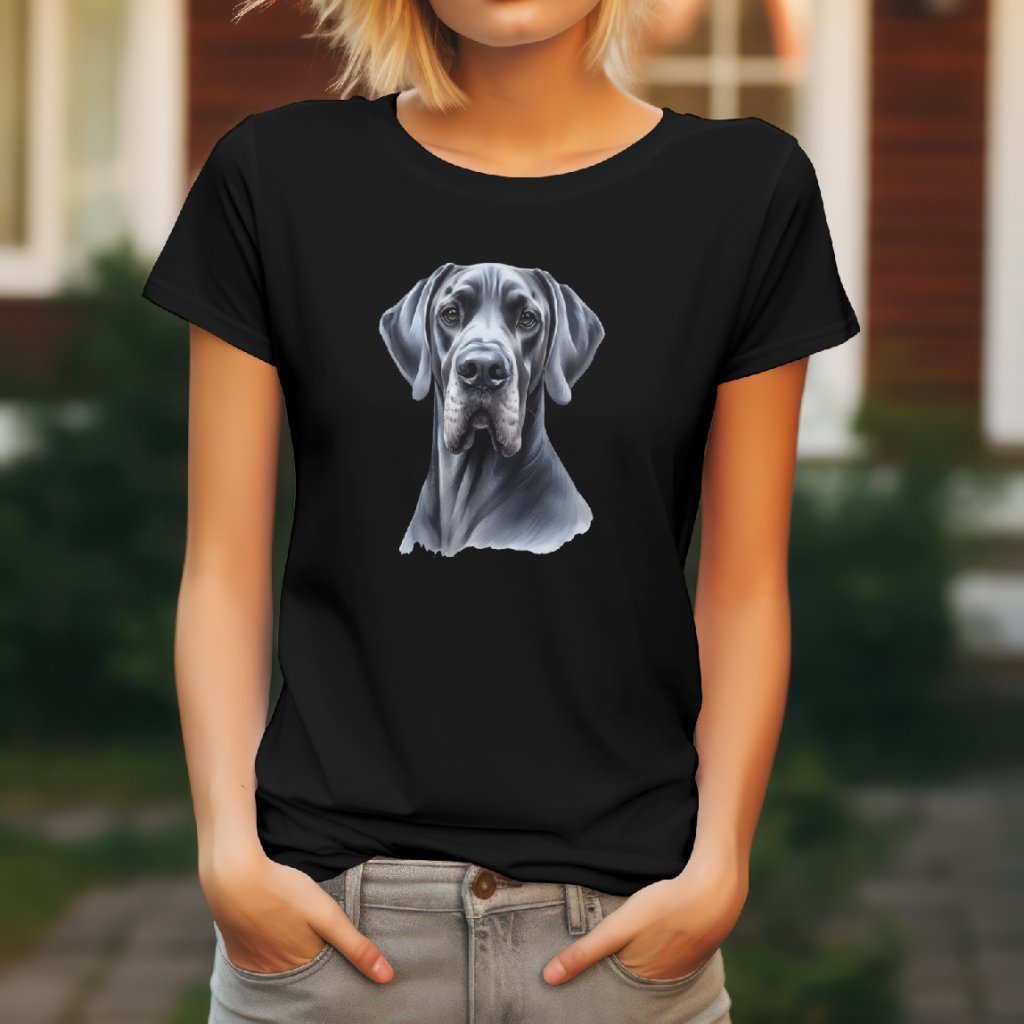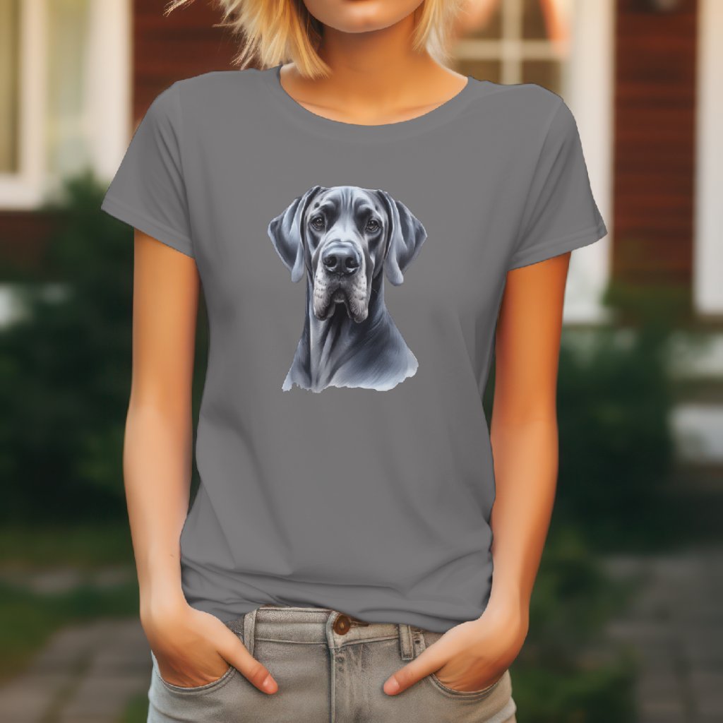 Na tričku je výrazný a realistický potisk hlavy Německé dogy s krátkou, tmavě šedou (modrou) srstí a ušlechtilým, soustředěným výrazem. Pes má laskavý, ale majestátní pohled, který je pro toto psí plemeno charakteristický. Kvalitní potisk zachycuje sílu a eleganci, což z trička dělá originální dárek s osobním kouzlem pro každou pejskařku.