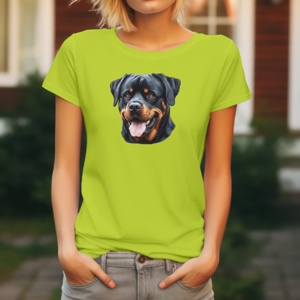 Na tričku je výrazný a realistický potisk hlavy Rotvajlera s typickou černou srstí a hnědými (pálenými) znaky. Pes má otevřenou tlamu s vyplazeným jazykem, což vyjadřuje jeho přátelskou a energickou povahu. Jeho bystrý a pozorný pohled je pro toto psí plemeno charakteristický. Rotvajler je známý jako strážný pes a společník, a právě tato osobnost psa je v potisku dokonale zachycena. Kvalitní potisk zachycuje sílu a eleganci, což z trička dělá originální dárek s osobním kouzlem pro každou pejskařku.