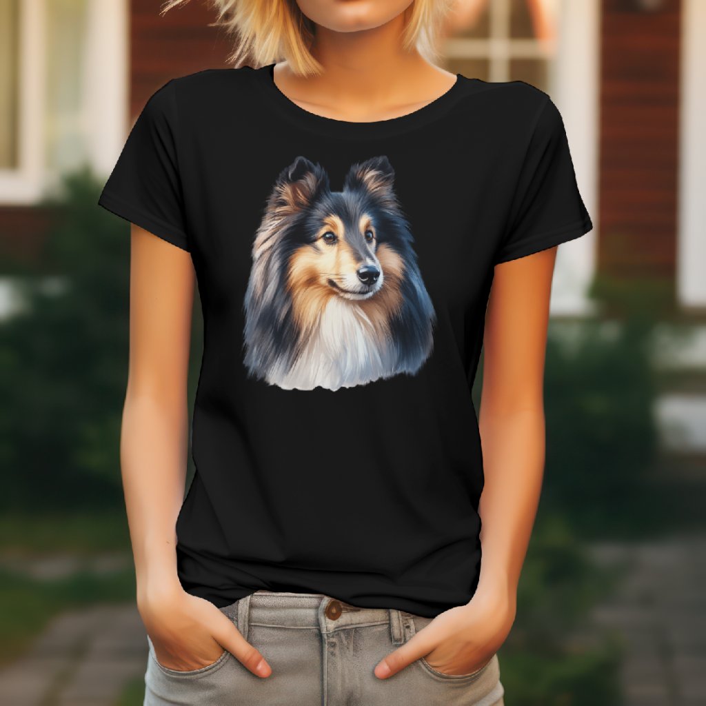 Dominantou trička je vysoce detailní a realistický portrét Shetlandského ovčáka. Motiv precizně zachycuje inteligentní a pozorný výraz tohoto plemene, včetně jeho typicky bohaté srsti a bystrých očí. Umělecké stínování a jemné detaily vykreslující strukturu srsti dodávají grafice hloubku, díky čemuž tento originální motiv psa na tričku působí velmi živě a elegantně.