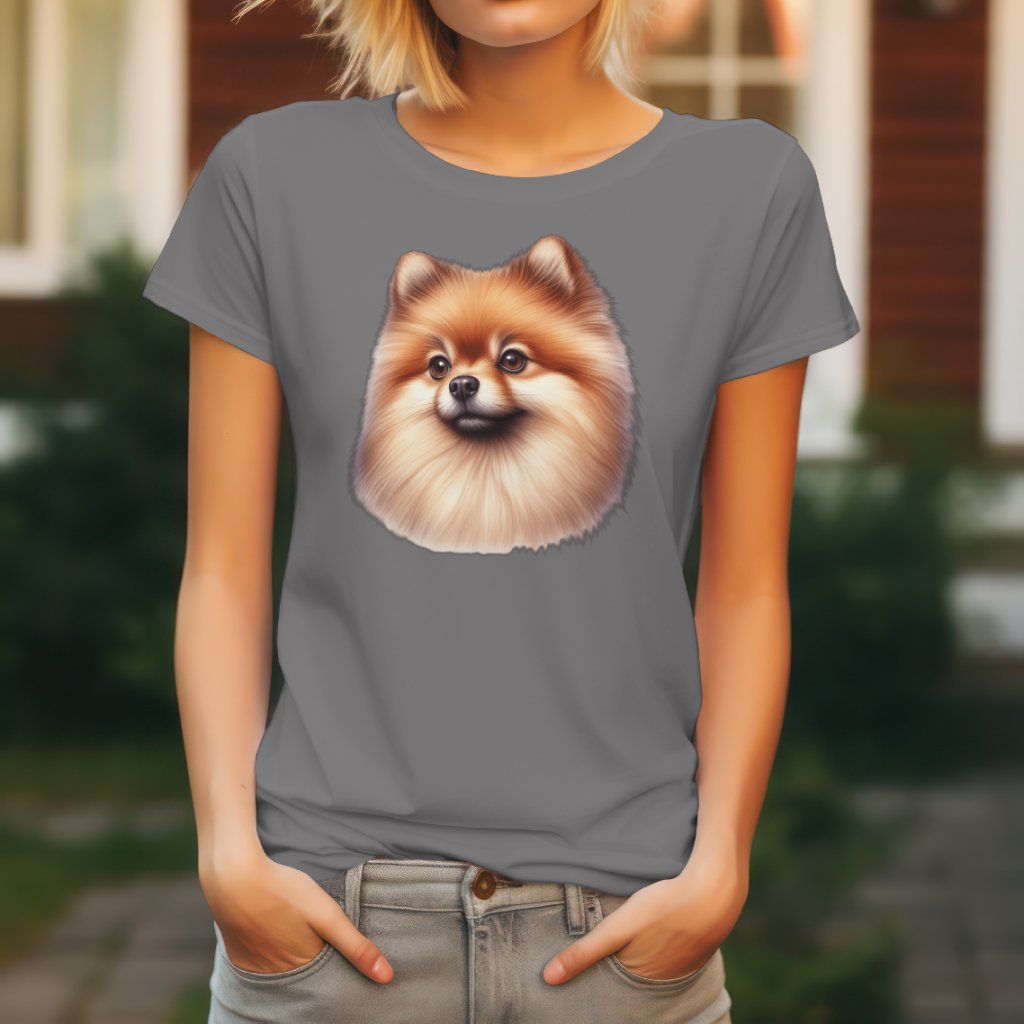 Dominantou trička je realistický a detailní potisk psa. Motiv zobrazuje hlavu Pomeraniana s jeho typicky nadýchanou srstí a bystrým pohledem. Ilustrace je vyvedena v teplých oranžových a krémových tónech, které působí velmi živě a díky stínování získávají hloubku. Tento originální motiv vynikne na tmavém i světlém podkladu a zaručeně přitáhne pozornost okolí.