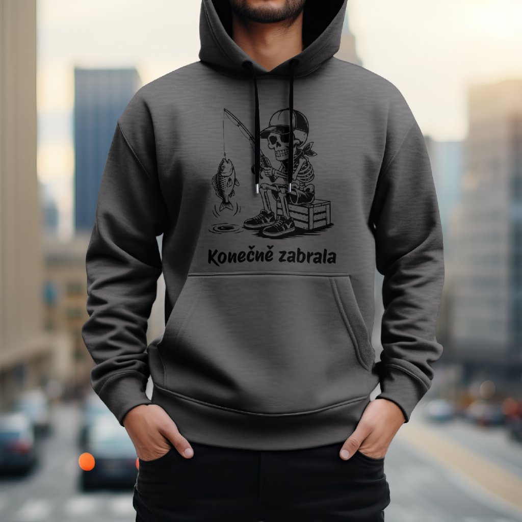 Na mikině je výrazný, vtipný potisk černobílé kresby. Motiv znázorňuje kostlivce, který sedí na bedně u vody s rybářským prutem, s kšiltovkou na hlavě a úsměvem. Z prutu mu visí malá ryba. Pod potiskem je nápis: "Konečně zabrala". Tento motiv je symbolem trpělivosti a humornou připomínkou, že se někdy u vody čeká "celou věčnost".