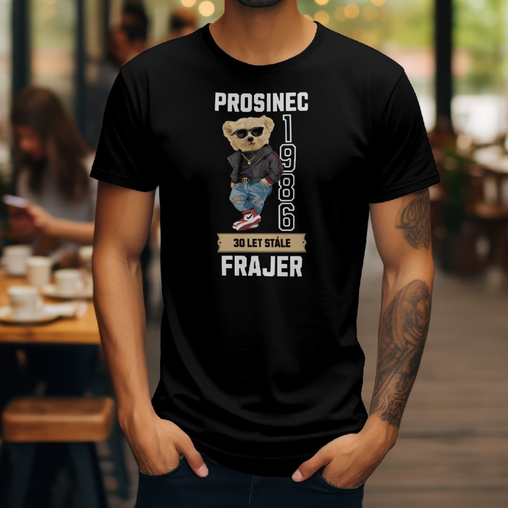 Středobodem designu je detailně vykreslený plyšový medvídek v černé kožené bundě, stylových džínách a moderních teniskách. Na prvním obrázku je tato postavička doplněna vertikálně orientovaným rokem narození a názvem měsíce. Spodní nápis „30 let stále frajer“ (nebo jakýkoliv jiný věk) jasně definuje nositele jako muže v nejlepší formě. Kvalitní potisk vyniká vysokou odolností a živými barvami, které přežijí i ty nejdivočejší narozeninové jízdy.