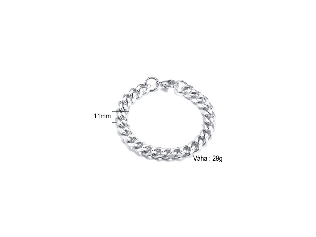 - Rozměry: Délka náramku je přibližně 21 cm (délka se může mírně lišit v závislosti na velikosti zápěstí), šířka článků je 11 mm.