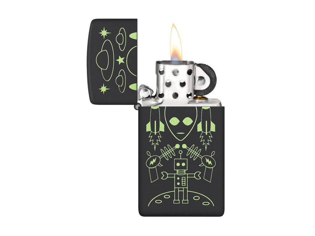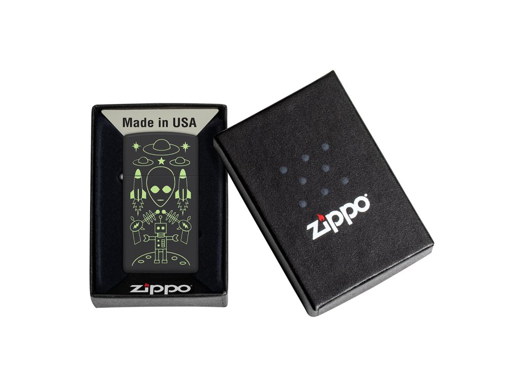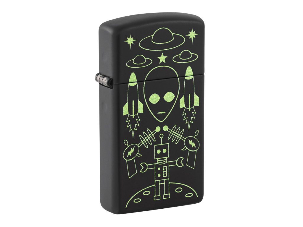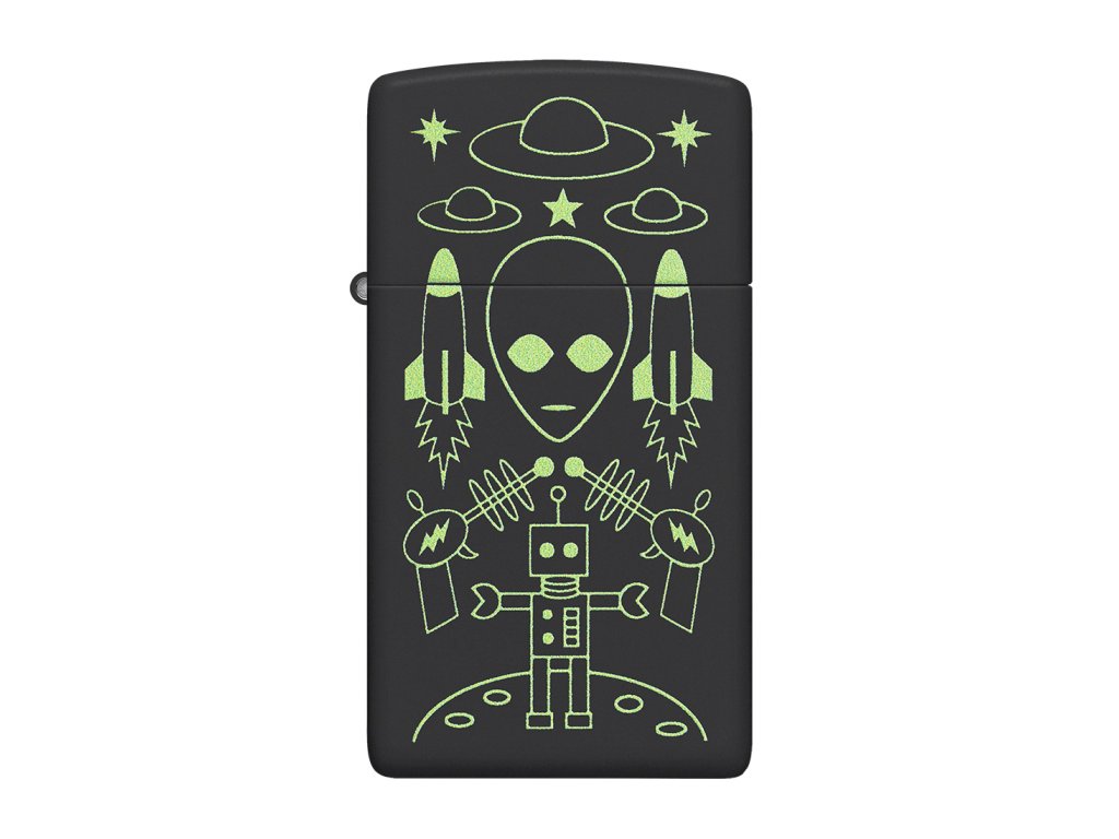 Tento unikátní Zippo zapalovač s názvem Slim® Alien se odlišuje od ostatních svým štíhlým profilem a matným černým povrchem, který působí moderně a nenápadně. Design na něm, provedený technologií Color Image, je hravý a rozmarný. Zobrazuje vznášející se hlavu mimozemšťana, obklopenou létajícími talíři, raketami a robotem cestujícím po Měsíci. Tento kosmický a sci-fi motiv z něj dělá skvělý dárek pro fanoušky sci-fi, humoru a vesmíru.