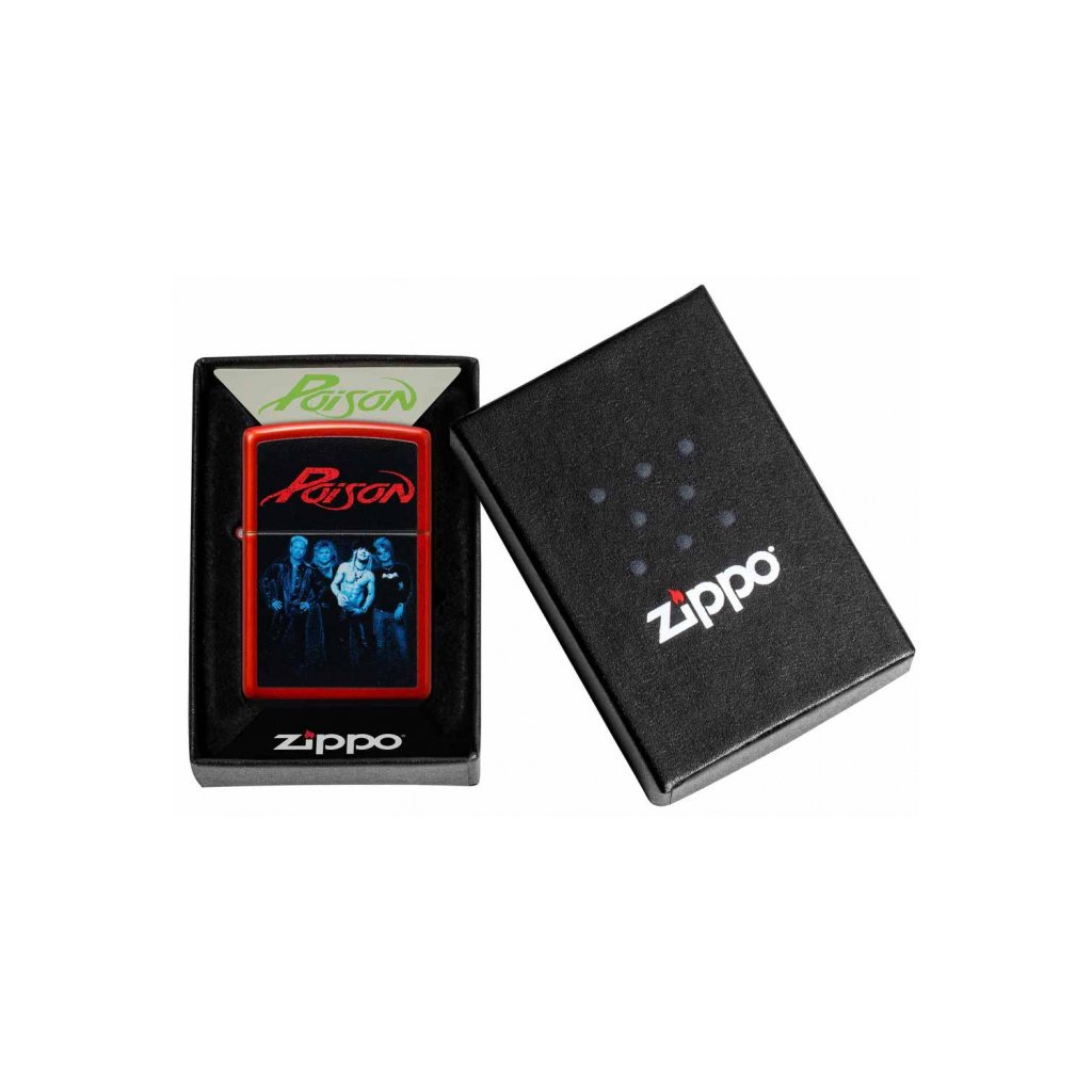 Krásný benzínový zapalovač Zippo s ikonami skupiny Poison před logem kapely. Poison je americká glam metalová skupina, která největší popularitu získala na přelomu 80. a 90. let
