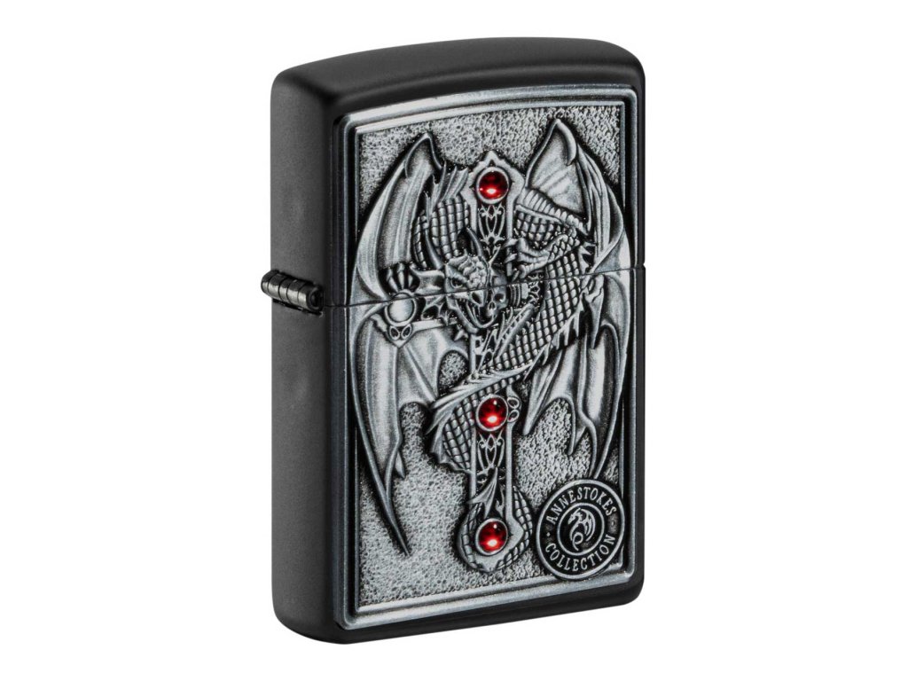 Tento originální Zippo zapalovač v klasickém tvaru a s oblíbenou povrchovou úpravou Black Matte se pyšní jedinečným a působivým emblémem s gotickou tematikou. Hlavním prvkem je ohromující filigránový drak z představ umělkyně Anne Stokesové. Tento složity a detailní emblém je pevně připevněn k matnému černému povrchu, což vytváří výrazný kontrast. Oči a tělo draka jsou osazeny zářivými červenými drahokamy, které efektně zvýrazňují celkový design a dodávají mu nádech luxusu.