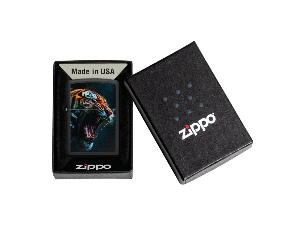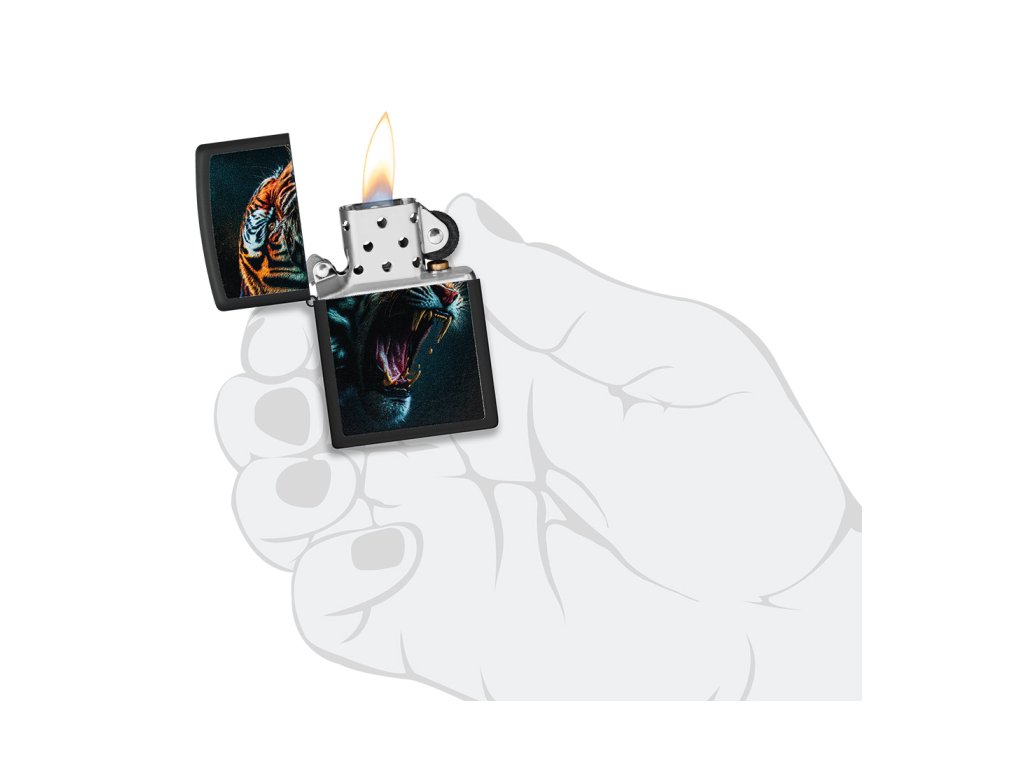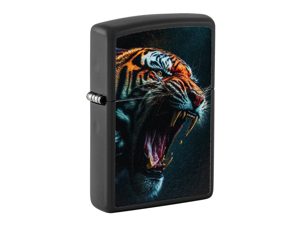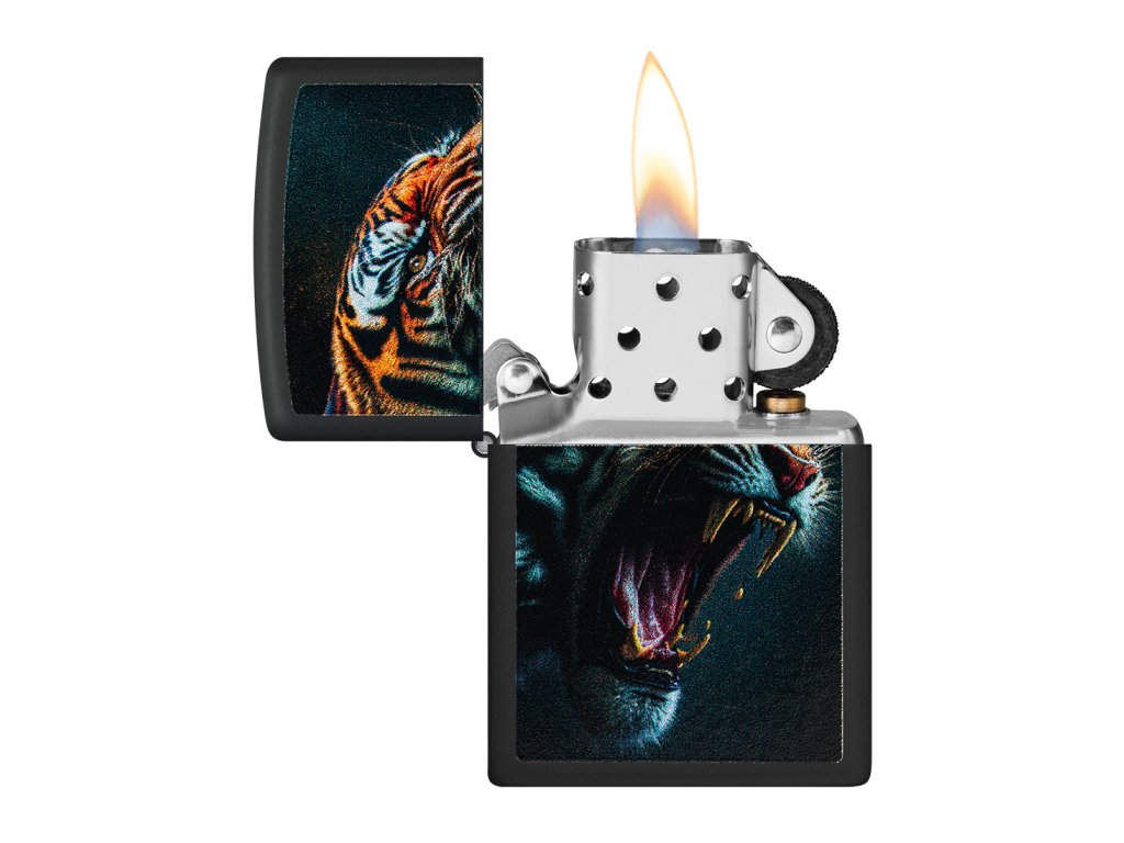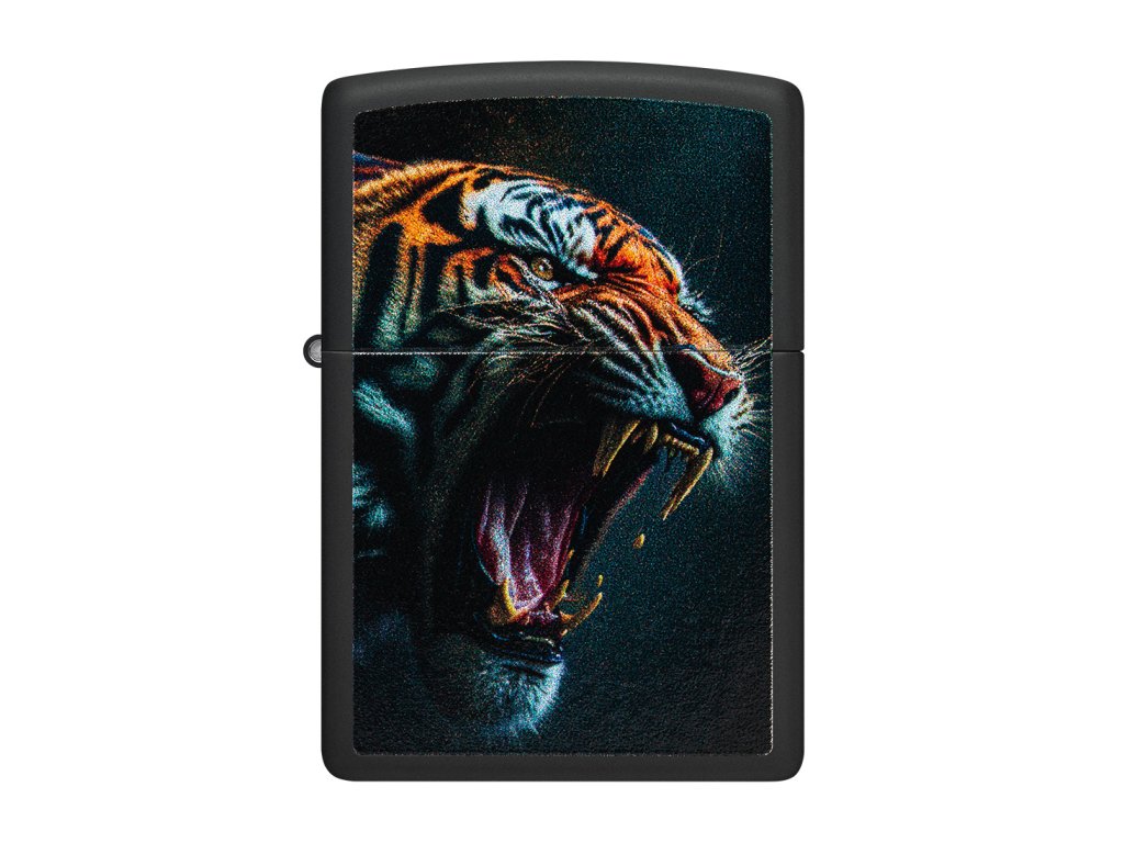Zapalovač zobrazuje detailní portrét řvoucího tygra. Tygr je zobrazen s otevřenou tlamou a vyceněnými zuby, což vyjadřuje jeho sílu a divokost. Jeho srst je detailně propracovaná a motiv je doplněn jemnými detaily, jako jsou stíny a odlesky, které mu dodávají hloubku a realističnost.